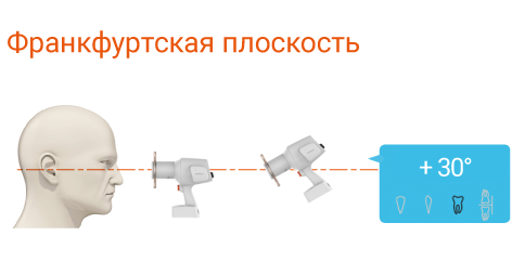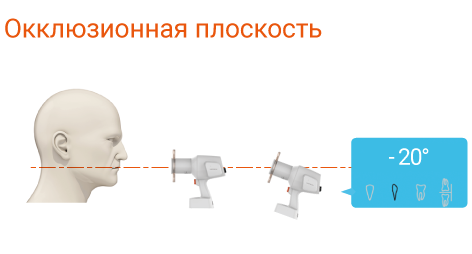 Автоматическое позиционирование делает процесс подготовки простым. Существуют настройки экспозиции по умолчанию для угла съемки каждого зуба. Оператору необходимо только сопоставить референс-линию с окклюзионной или франкфуртской плоскостью и поднести тубус к месту планируемой съемки, так как угол и зуб будут обнаружены автоматически . Время экспозиции будет установлено автоматически.