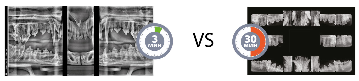Процедура может быть выполнена в течение 3 минут с более мягкой седативной нагрузкой на пациента, и это более чем в 7 раз быстрее, чем традиционная процедура рентгенографии всей полости рта. Фактическое время сканирования составляет 15 секунд для обеих челюстей. Панорамные изображения обеспечивают больший охват дефектов кости и повреждений челюсти.