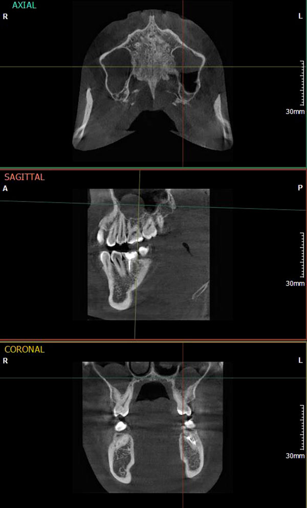 При возникновении осложнений имплантации на верхней челюсти только использование конусно-лучевой томографии позволяет достоверно измерять расстояния до верхнечелюстной пазухи, определять морфологическое состояние костной ткани, положение имплантата по отношению к смежным анатомическим образованиям при низком лучевом воздействии на пациента.