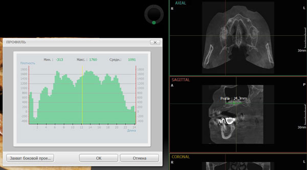 Рис.3 Программное обеспечение Ez3D-i. Дентальная объемная томограмма. Определение плотности остеопластического материала при планировании имплантации через 6 месяцев после операции синус-лифтинг