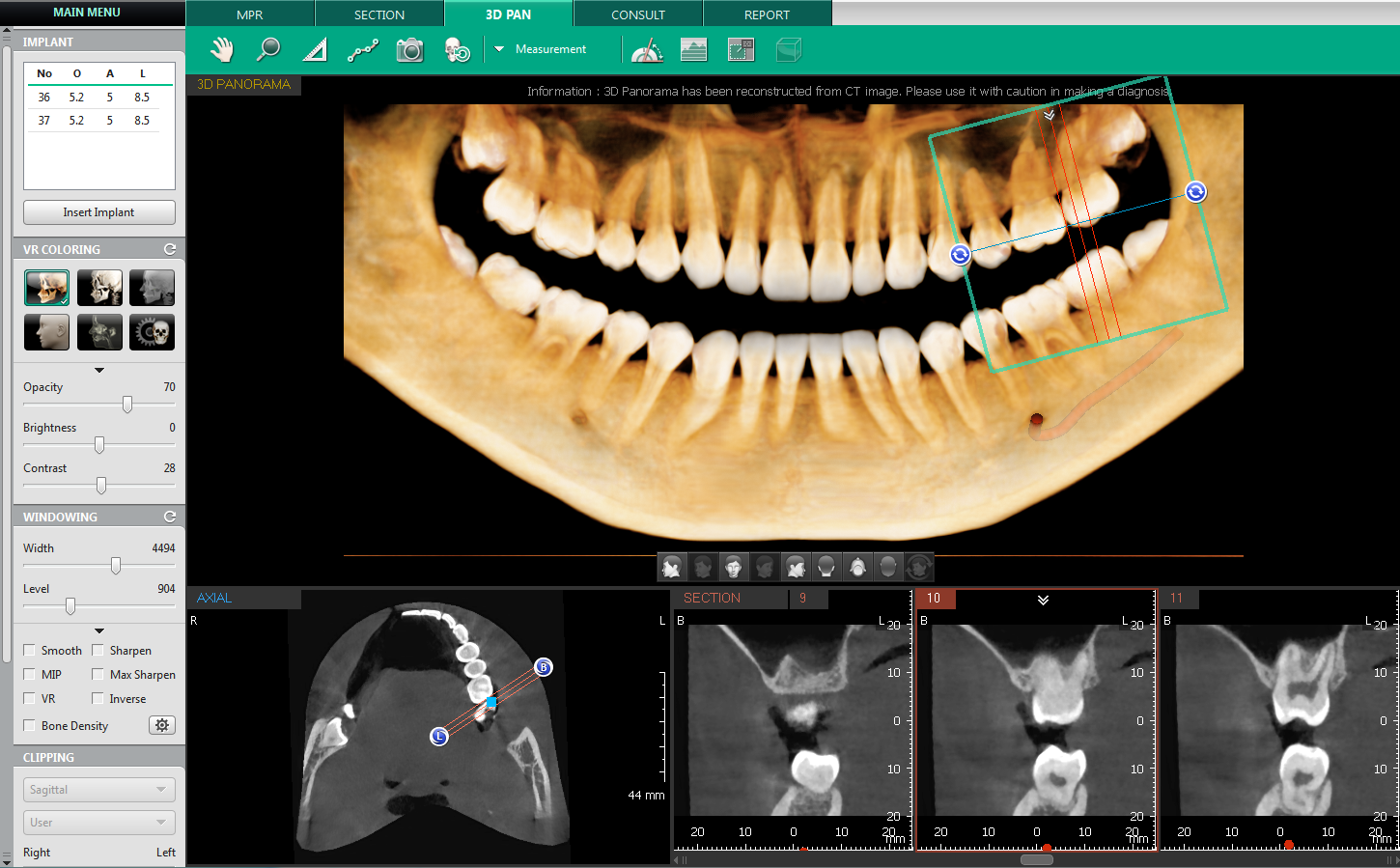 Специализированная программное обеспечение Ez3D-i V4.3.0 от Vatech (Рис.1.) , обрабатывающее данные конусно-лучевой компьютерной томографии, значительно облегчает планирование операции и последующую диагностику. Приложение создает трехмерные реконструкции изображения, представляя максимально полную информацию о степени атрофии костной ткани альвеолярного отростка, что существенно повышает точность проведения операции дентальной имплантации и предимплантационных вмешательств, а также прогнозирования результата хирургического вмешательства.