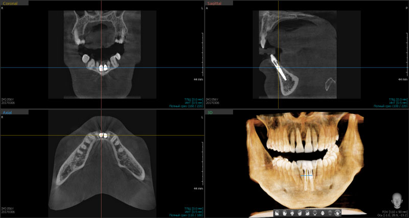 Рис. 6 Дентальная объемная томограмма после проведения одномоментной имплантации в проекции 31,41 зубов. Инклинация имплантатов корректна