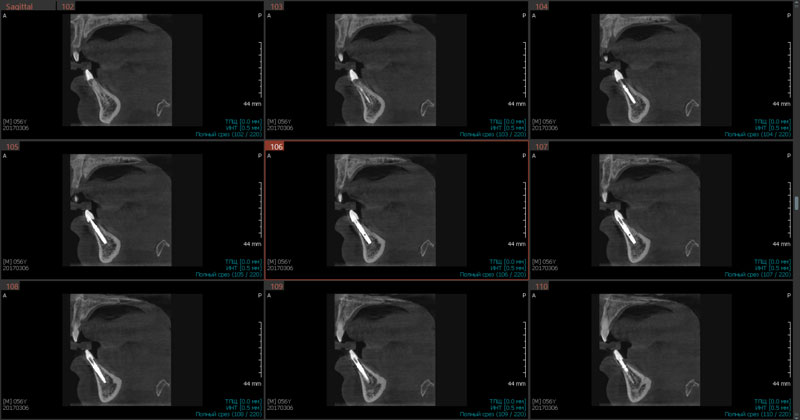 Следует выделить кросс-секции, которые обеспечивают полную ясность при анализе, моделировании виртуального имплантата, проверке корректности его установки, выделяя важные показатели клинического случая: градус наклона, визуализация качества эндодонтического лечения соседних зубов (Рис.7).
