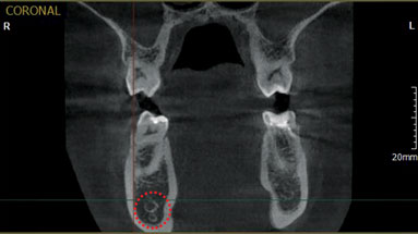 Рис.6 Дентальная объемная томограмма во фронтальной проекции. Раздвоенность нижнечелюстного канала в теле челюсти