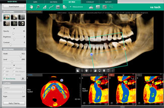Программные обеспечения легко интерпретируют клинический случай, а также за один оборот конического луча в 360 проекциях, дают возможность получить 2 изображения - ортопантомографию с функцией Magic Pan (Рис.2) и 3D реконструкцию объекта исследования. EzDent-i - прикладная программа, рассчитанная для работы с двухплоскостным изображением. Программное приложение оснащено различными макетами для удобства интерпретации клинического случая.