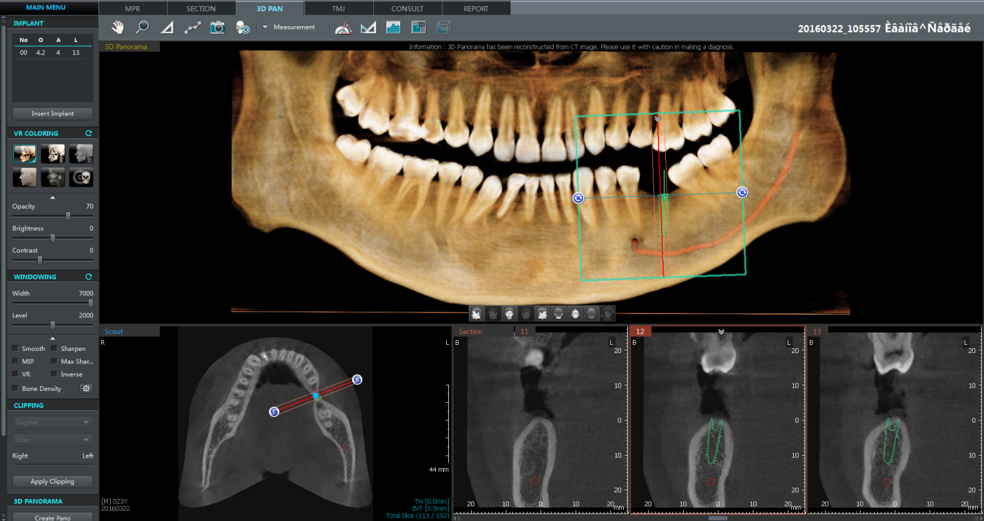 Рис.1 3D-панорама Ez3D-i V4.3.0, виртуальная установка дентального имплантата в область отсутствующего 46 зуба.